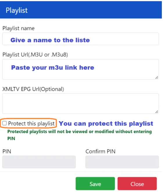 • URL de la lista de reproducción (M3U o M3U8): Pega tu enlace m3u aquí.
