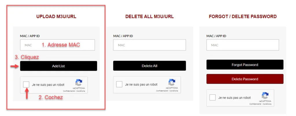 3 – En el sitio web, ingresa la dirección MAC de tu aplicación Net IPTV, completa el Captcha y luego haz clic en Agregar lista.